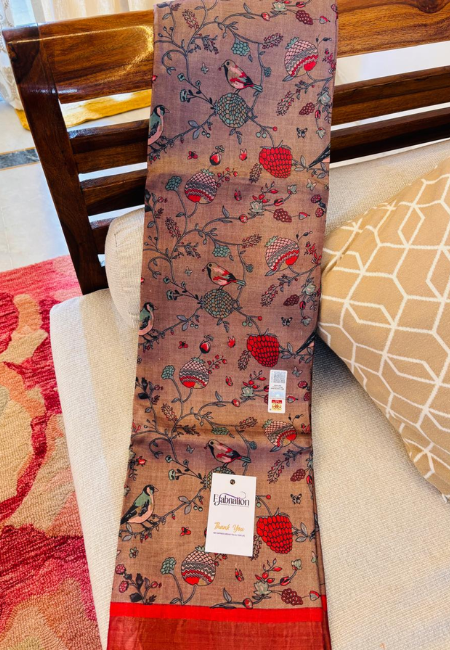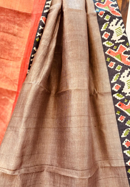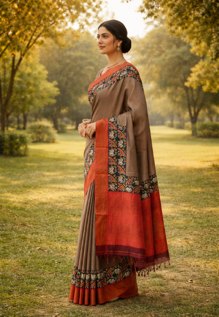 Pure Tussar Silk Handloom Saree – Earthy Brown with Red & Black Border