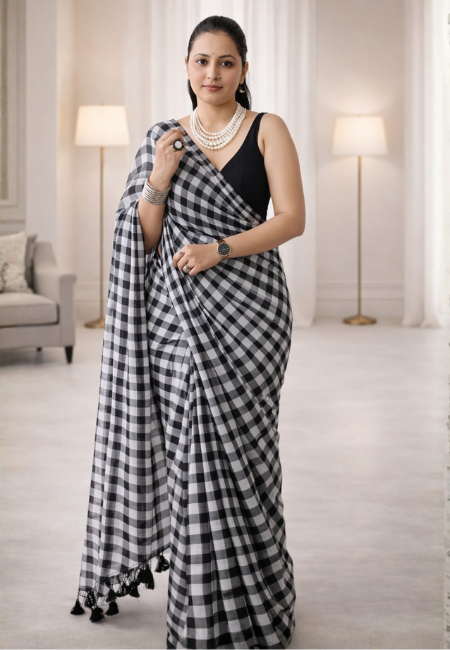 Pure Mul Cotton Saree – Black & White Checkered Elegance