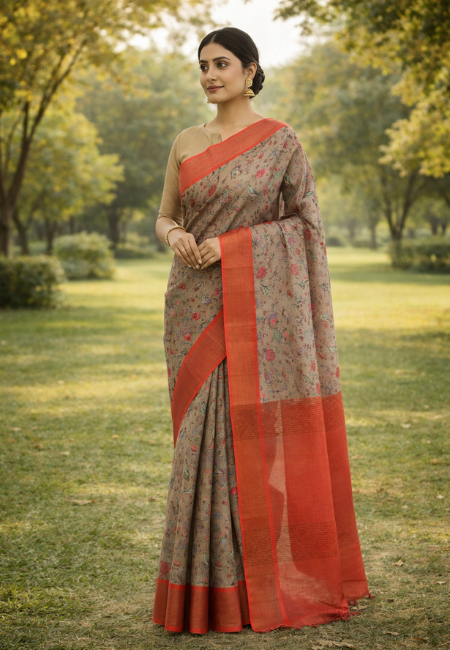 Pure Tussar Silk Handloom Saree – Beige with Rust Red Border