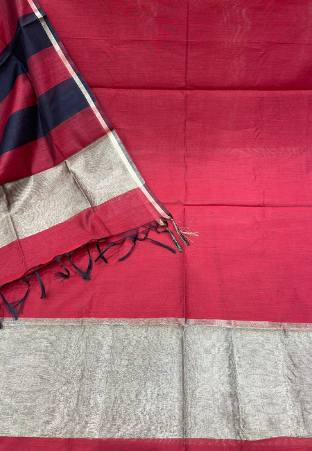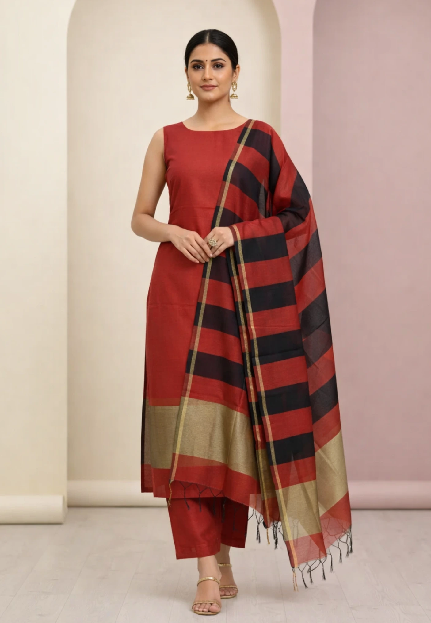 Unstitched Banarasi Cotton Suit with Stripe Dupatta – Brick Red & Black Elegance