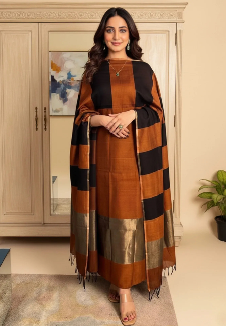 Unstitched Banarasi Cotton Suit with Resham Stripe Dupatta – Rust Brown & Black Elegance