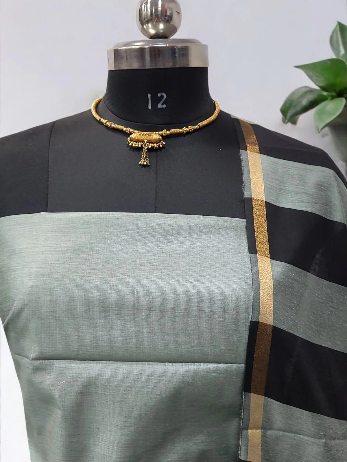 Unstitched Banarasi Cotton Suit with Stripe Dupatta – Silver Sage Green & Black Elegance
