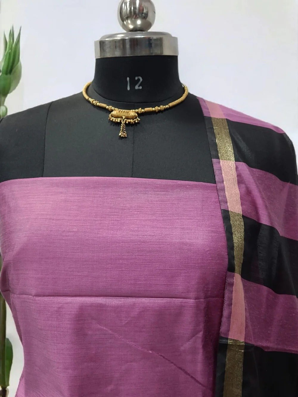 Unstitched Banarasi Cotton Suit with Resham Stripe Dupatta – Royal Purple & Black Elegance