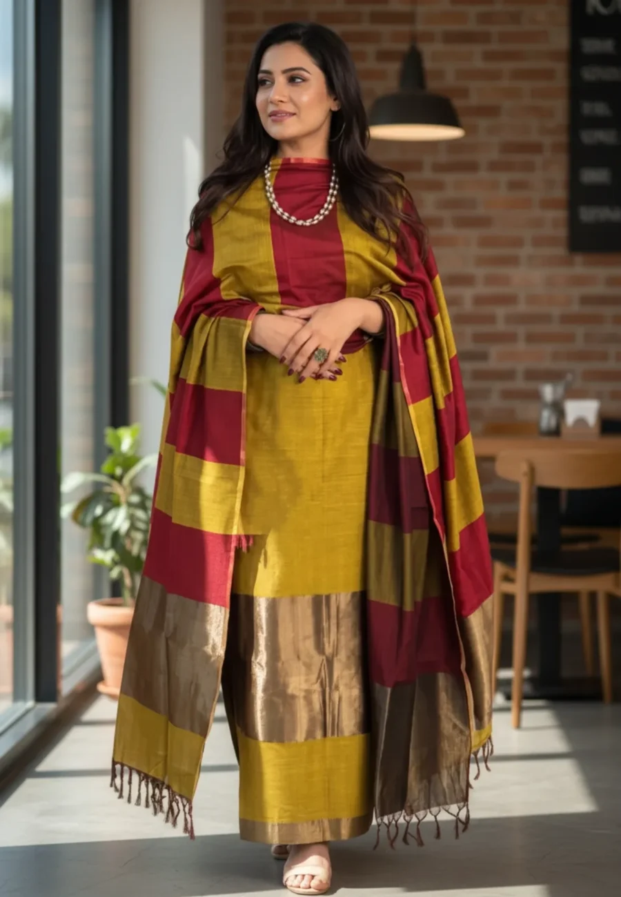 From our Exclusive Banarasi Collection, this unstitched suit set is crafted for women who love classic colour contrasts with everyday comfort. The top is made from mustard yellow cotton fabric, enhanced with an elegant zari patta that adds a subtle festive sheen. Complementing the suit is a cotton dupatta featuring resham stripe weaving in mustard yellow and maroon tones, finished with a rich zari border for a luxurious drape. The ensemble is completed with a plain cotton bottom in matching mustard yellow, ensuring breathable comfort and a refined finish. Ideal for festive celebrations, cultural gatherings, and elegant ethnic wear, this set reflects timeless craftsmanship with vibrant appeal.