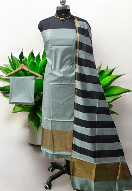 Part of our Exclusive Banarasi Collection, this unstitched suit set is thoughtfully crafted for women who love minimal elegance with strong contrasts. The top is made from silver sage green cotton fabric, offering a smooth texture and subtle sheen for effortless wear. Complementing the suit is a cotton dupatta featuring broad black stripes with a rich golden zari border, adding depth and a striking visual balance. The set is completed with a plain cotton bottom in matching silver sage green, ensuring comfort, breathability, and versatile styling. Ideal for festive gatherings, office ethnic wear, and elegant daytime occasions, this ensemble blends simplicity with classic Banarasi appeal.