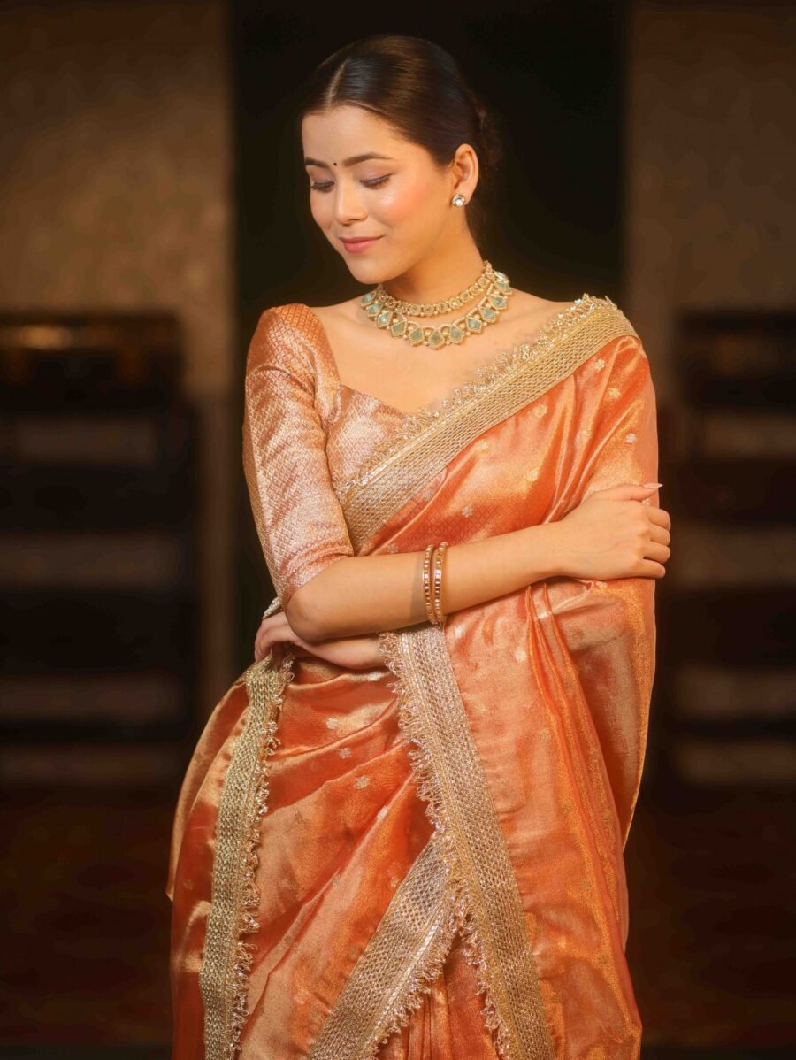 Banarasi Semi Tissue Silk Saree in Orange – Elegant Lace Border & Zari Detailing