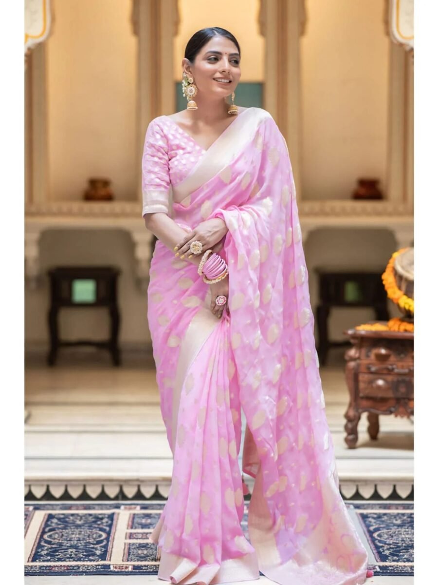 Indulge in delicate sophistication with this Semi-Georgette Silk Woven Water Zari Saree in a serene blush pink hue. Crafted to perfection, it features fine golden zari motifs woven intricately across a luxurious, dyeable fabric that feels as light as air. The semi-georgette silk gives it a soft, elegant fall, making it ideal for both festive and formal occasions. With its subtle sheen and timeless allure, this saree captures the essence of femininity and grace. Pair it with statement jewelry and soft-toned accessories to complete your radiant traditional look.