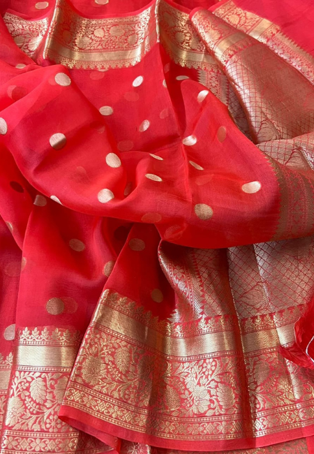 Bring festive radiance to your wardrobe with this Bright Red Banarasi Soft Organza Silk Woven Dyeable Saree, crafted with lightweight organza silk and intricate Banarasi craftsmanship. The saree features a luminous bright red body highlighted with golden zari polka buttis, giving it a festive sparkle and elegant texture.