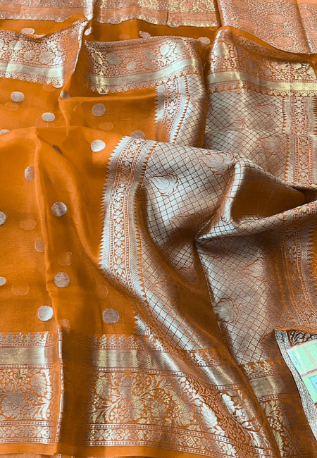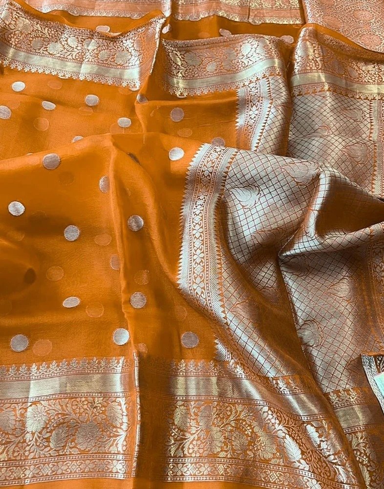 A beautiful burnt orange Banarasi Soft Organza Silk dyeable saree adorned with woven silver zari polka motifs and a rich traditional zari border.