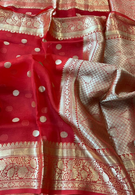 Make a bold and graceful style statement with this Cherry Red Banarasi Soft Organza Silk Woven Dyeable Saree, crafted with fine organza silk and intricate Banarasi weaving. The saree features a vibrant cherry red body beautifully decorated with shimmering golden-silver zari polka buttis, creating a festive and luxurious appeal.