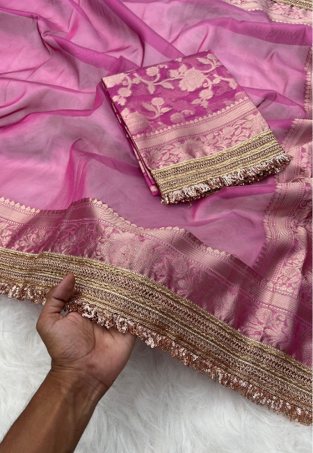 Celebrate timeless beauty and refined craftsmanship with this Elegant Pink Tissue Silk Woven Kaat Band Work Saree. Expertly woven, the saree showcases detailed kaat band work that adds depth and traditional charm to its design. The soft tissue silk fabric offers a subtle sheen and airy feel, creating a luxurious drape that remains lightweight and comfortable.