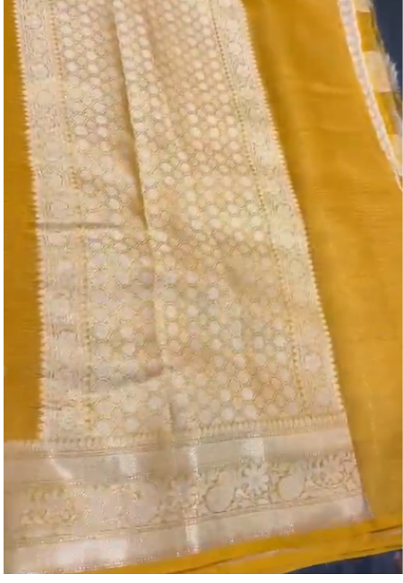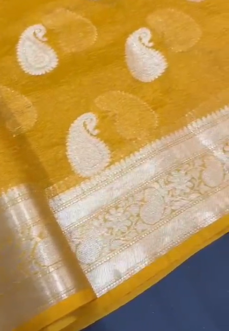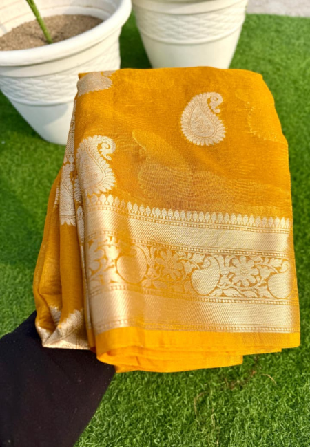 Celebrate the essence of tradition with this radiant Mustard Yellow Banarasi Cotton Tissue Silk Saree. Woven with fine dual zari craftsmanship, it showcases timeless kairi (paisley) motifs that beautifully capture the heritage of Banaras weaving artistry. The rich mustard hue paired with the natural sheen of tissue silk creates a luminous and festive charm.