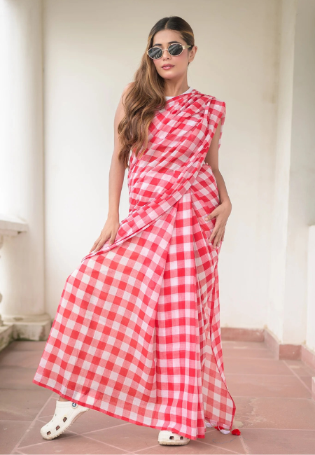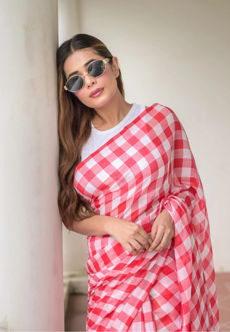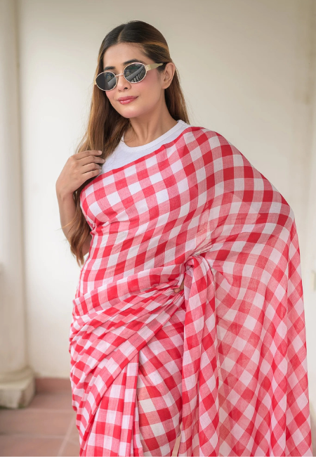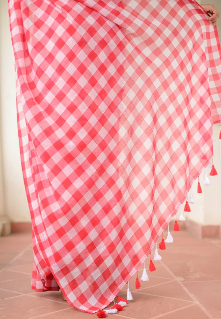 Crafted from premium pure mul cotton, this saree is exceptionally soft, airy, and lightweight — making it an ideal choice for warm weather. The timeless red and white checkered pattern adds a vibrant yet minimal aesthetic that never goes out of style. Its breathable weave ensures all-day comfort, while the fluid drape enhances your natural silhouette with grace. The beautifully finished pallu with tassel detailing adds a playful traditional touch.