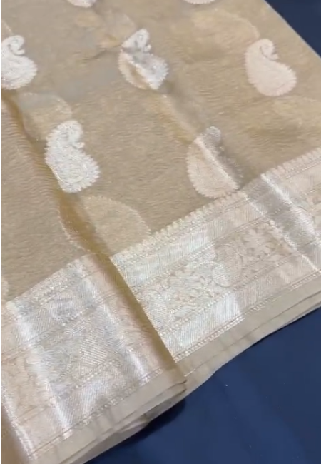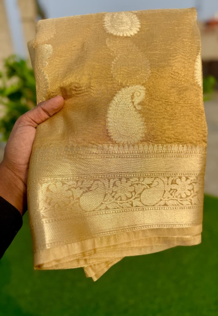 Celebrate the timeless beauty of Indian craftsmanship with this exquisite Golden Banarasi Cotton Tissue Silk Saree. Woven with dual zari threads, the saree features graceful kairi (paisley) motifs that enhance its traditional allure. The golden hue radiates warmth and opulence, perfectly complementing the rich texture of tissue silk.
