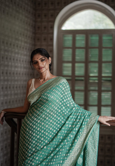 Add a refreshing charm to your wardrobe with this sea green cotton silk saree, beautifully designed with golden woven motifs and a detailed zari border. The soft fabric drapes gracefully, making it perfect for both festive and party occasions. Its subtle shine and intricate detailing bring out a rich, traditional look while keeping the style contemporary. This saree includes a matching blouse piece, ensuring a complete and stylish ensemble.