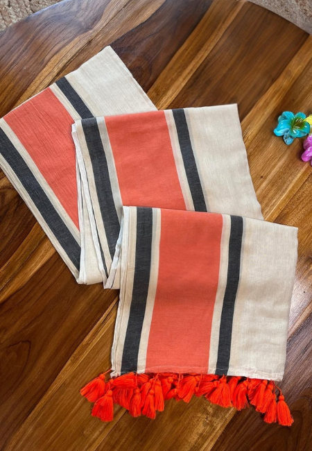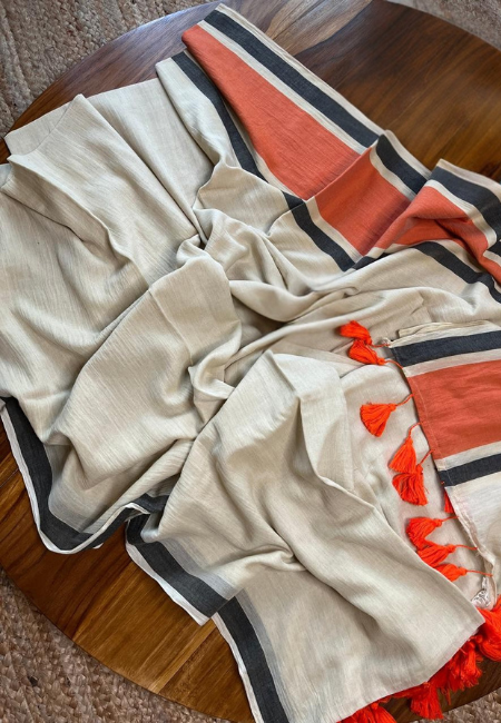 Bring home effortless elegance with this cream cotton mull saree highlighted by rust-orange borders and black detailing. Crafted from 120 count pure cotton, this saree feels feather-soft, breathable, and comfortable for long hours of wear. The tassel finishing at the pallu adds a trendy touch, making it suitable for both daily use and special gatherings. Since this saree is without blouse piece, you can style it with any matching or contrasting blouse of your choice to create multiple looks. A perfect pick for women who love simple, graceful, and lightweight sarees.