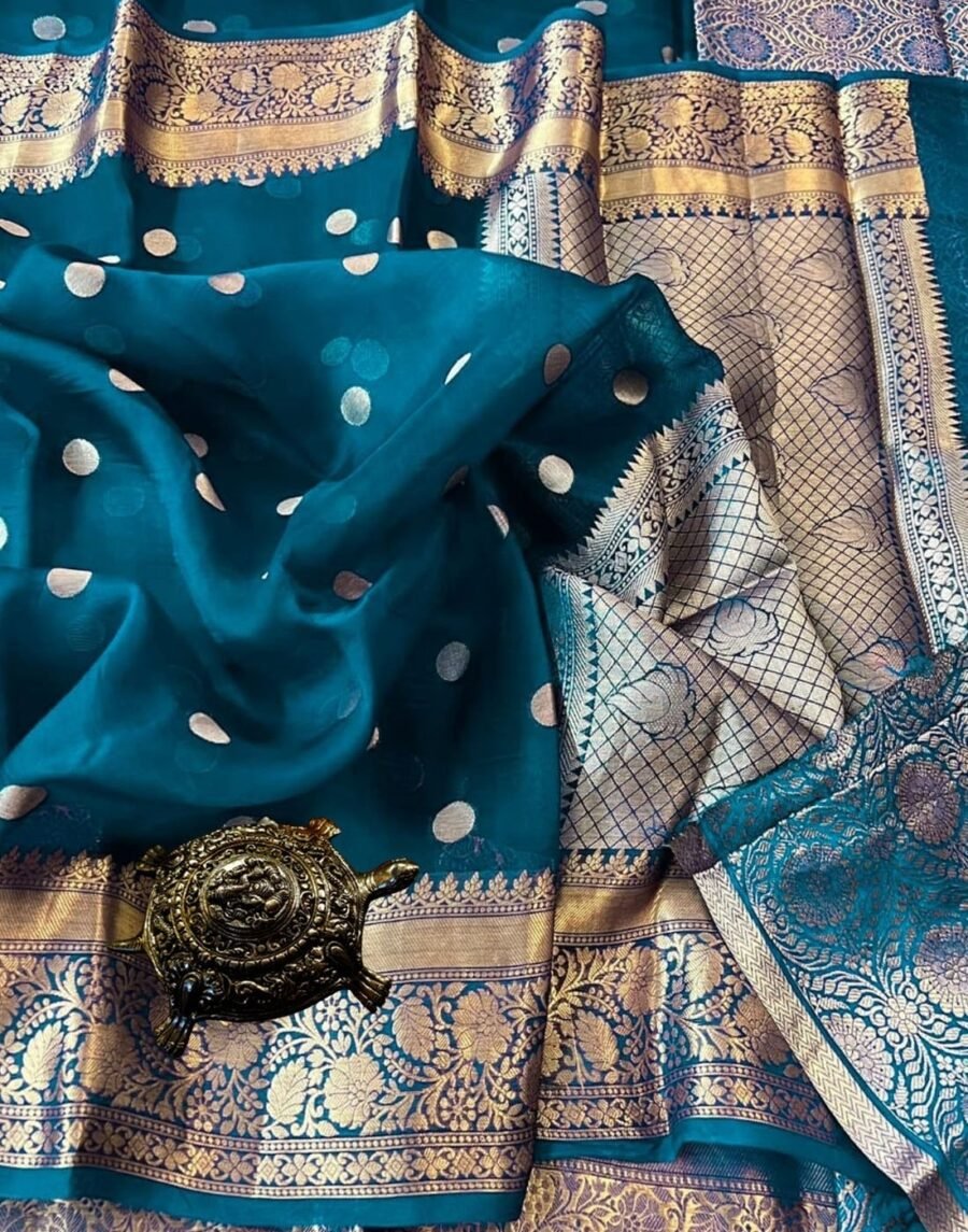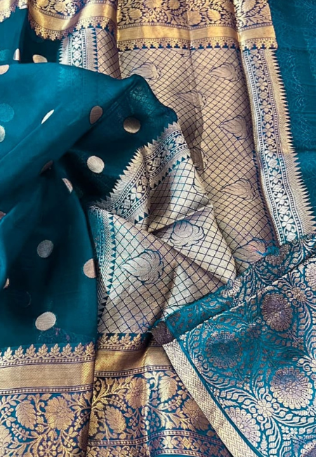 A rich teal green Banarasi Soft Organza Silk dyeable saree adorned with silver-golden zari polka motifs and finished with a luxurious traditional zari border.